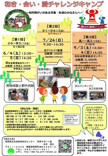 「和き・合い・愛チャレンジキャンプ」が来週6月4日に第1回目の開催を迎えます。今回の事業は知的障がいのある児童・生徒を対 象に、自然体験活動や社会体験活動のプログラムを通して、主体的に取り組む力や他者とふれあう力を育み、自立心 や社会性を身につける力を養うことを目的としています。現在、この事業へのボランティアを大募集しています。子ども好きな人はもちろん、将来学校の先生を目指している人など、子どもたちとのふれあいを通して様々な経験を積むことができます。興味のある方はぜひぜひ応募してください。お待ちしております。(せのん)