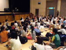 スタート前のインタビューで、「やっと晴れて嬉しい」という声が聞かれるほど待ちに待った晴れ間だったのですが、この晴れ間は本当に束の間で、ゴールの講堂にみんなが集合した途端に、また雨が降り出してしまいました。しかし、計算タイム中に「裏山で何か発見がありましたか?」とお聞きしたところ、「カブトムシの匂いがした!」、「キノコが生えていた!」といった答えも聞かれ、短い時間でも自然と触れ合うことができた人もいたようです。よかったですね!