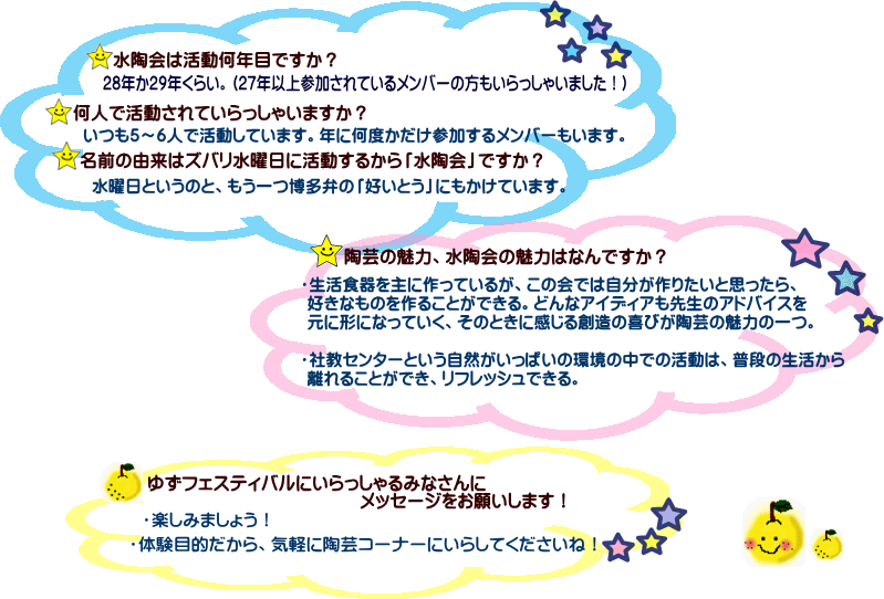 ぜひ、ゆずフェスティバルで、「創造の喜び」を体験されてみませんか?また、水陶会では水曜日に一緒に活動する会員も随時募集中だそうです!