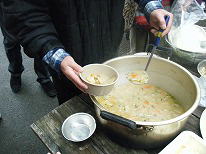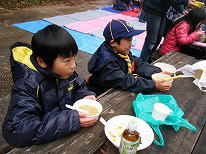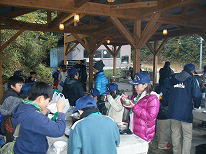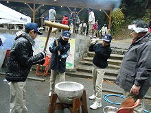 | あじさい広場にうかがうと、元気な掛け声をかけながら、もちつきが行われていました。参加している「ビーバースカウト隊(年長〜小2)」のみなさんが樹芸の森へハイキングに行っている間に、「ボーイスカウト隊(小5〜中3)」と「カブスカウト隊(小2〜小5)」のみなさんが野外調理と餅つきを行い、できたものを全員で昼食としていただきます。 |