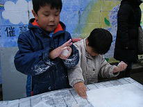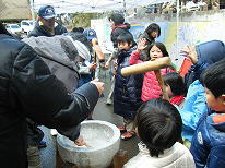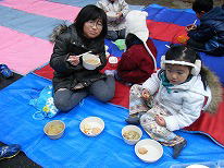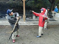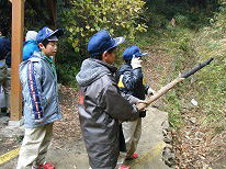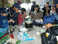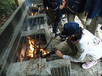| 餅つきの順番を待つ間、隊員のみなさんは、かまどに薪をくべたり、年輪のきれいな枝を輪切りにしておみやげにしたり、木の枝を使ってチャンバラごっこをしたりと自然と触れ合っていました。 |