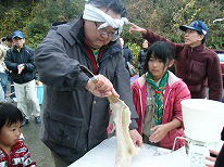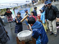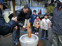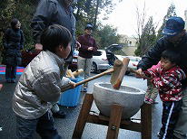 「よいしょよいしょ」持ち上げるだけで重い杵ですが頑張っています。力強くお餅がつかれていきます。 |