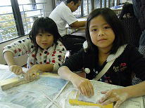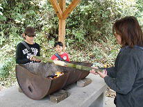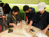 「竹笛」は何度か試しに吹いて、きれいな音が出る角度で固定をします。マイ竹笛の音色に思わず笑顔がこぼれます。 |