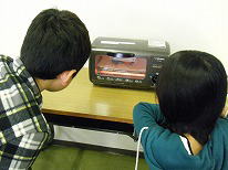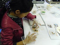 聴診器を使って動物の心臓の音を聞いています。命のぬくもりを体感しました。 |