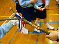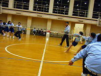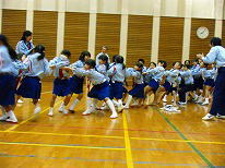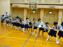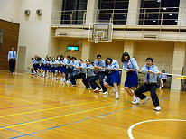 | この時間に行われた研修は、参加者全員での綱引きでした。それぞれの隊で2つのチームを作り、合計6チームで綱引きを行います。優勝チームには“豪華”な賞品が贈られます。 |