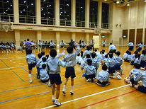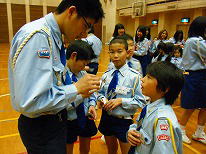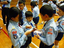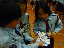 | 綱引きのあとは、名刺交換が行われました。海洋少年団の活動の中では恒例なのだそうです。みなさん自分の名刺を持っています。名刺を交換して握手。年齢や性別に関係なく他の団の仲間と積極的に交流します。 |