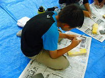 | マジックで描いた線に沿って早速、削り始めます。 みなさんの背中から真剣さが伝わるでしょうか? |