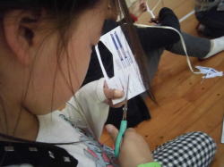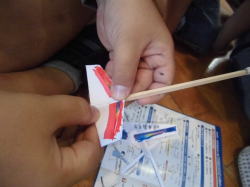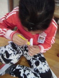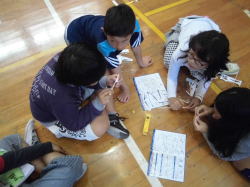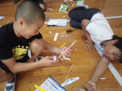 言葉や図の説明では理解することは難しく、手が止まってしまった子や「わからーん」っと言って倒れ込む子もいました。しかし、自然教室で培われた協力する心が生かされたようです。班の中で作り方を理解できた子がしっかりと仲間をサポートしている様子が見られました。