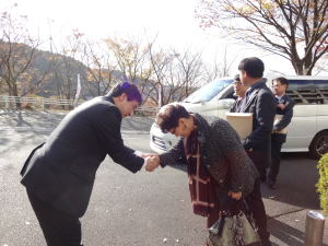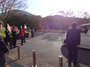 当センターで日頃から子どもたちの見送りをする際に使用している手づくりの大きな手を着けてお見送りをしました。大変喜んでくださり、私たちがお見送りしている姿も写真に撮っていらっしゃいました。