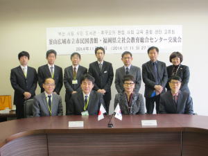 | 県立社会教育総合センター周辺の紅葉も見ごろになった11月27日(木)に、釜山広域市立市民図書館の職員の方4名と通訳の方1名が,当センターとの交流会のため来所されました。 県立社会教育総合センターは、平成16年7月より釜山地域平生教育情報センターと協定を結び、また、平成23年3月に釜山地域平生教育情報センターの組織変更に伴い、センターを共同運営してきた釜山広域市立市民図書館と交流協定が結ばれました。 センター職員は韓国語で「アニョハセヨー」と挨拶をして、釜山広域市立市民図書館の皆様をお出迎えしました。