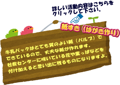 | 雨天時には館内プログラムで、社教センターの思い出づくりをしてみてください。 | ||||