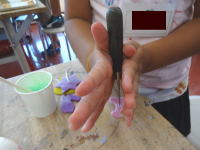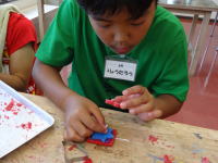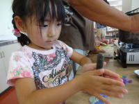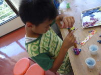 最後に、千枚通しでキャンドルに穴をあけ、芯を通しながら組み立てていきます。 細かい作業でなのでみなさん真剣な顔つきで作業しています。 |