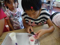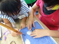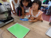 まず始めに、ロウを溶かし、クレヨンを削り入れ色を付けます。 |