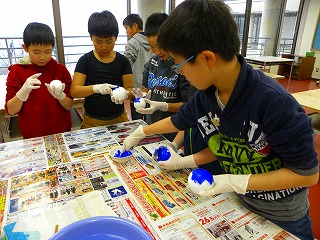 1日目:土を湿らせてどろ団子の芯をつくり、徐々に大きくしていきます。その後少し乾かしてからどろ団子の周りにしっくいを塗っていきました。しっくいがなかなかどろ団子につかず難しかったですね。 |