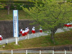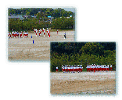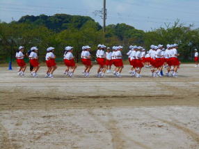 まずは、行進の足の上げ方や手の振り方から指導が始まりました。「もっと足をあげて!」「回れ右!」など、指導されている先生の掛け声が響いていました。まだまだ全員の息がそろわずになんとなくバラバラな感じでした。