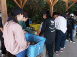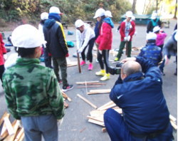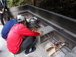 最初に全員が薪割りを体験し、その後各グループで役割分担をして調理を行っていました。