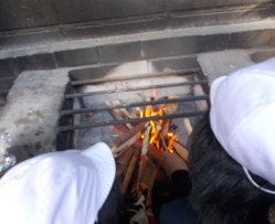 食材係さんがパン生地を捏ねている間に、薪割りをし、みんなで形を整えてから釜戸で焼きました。