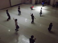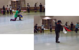 センター2Fのプレイホールで拳法(長拳、太極拳、酔拳など)の練習や武器(剣、槍)を使った練習に取り組んでいました。