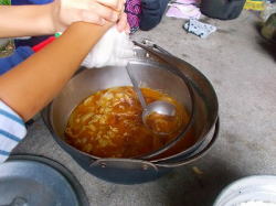 | まず始めに、ロウを溶かし、クレヨンを削り入れて色を付けます。 |