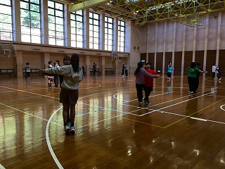 クラスごと輪になり、手をつないだままフラフープをくぐらせます。なかなか難しいようでしたが、クラス全体で話合ううちにどんどんコツをつかんできたようでした。