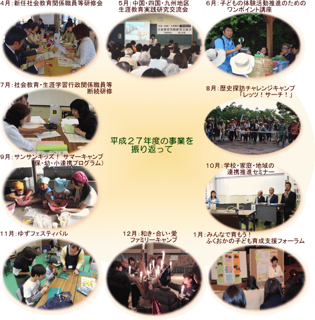 当センターは、県民の社会教育活動や青少年の体験活動を支援する社会教育施設として、3つの重点目標「県民の学習活動支援」「福岡がめざす子どもの育成」「社会教育関係者等の養成」を掲げています。本年度は新規事業として、社会教育関係職員の断続研修や小・中学生を対象とした4泊5日の歴史探訪チャレンジキャンプを実施しました。