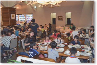 | センター主催事業「はじめてチャレンジ!ドキドキキャンプ」のレストランでの食事風景 |