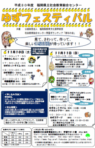 さて、当センターでは11月10日(土)、11日(日)の2日間、地域の皆様に創作活動・体験活動を楽しんでいただく「ゆずフェスティバル」を開催いたします。今年もすでに宿泊予約は締め切り前にいっぱいとなっております。多くの皆様の申込みに感謝しております。なお、11日(日)のアクティビティは事前申込み無しでも参加できます。創作活動・体験活動に興味のある大人や子ども、ボランティア活動に興味のある方は、どうぞ当センターへお越しください。御家族での参加も可能です。