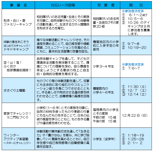 また、当センターでは「鍛えよう!ほめよう!体験活動推進プロジェクト」として、様々な子どもたちのための体験活動推進事業を実施しています。
