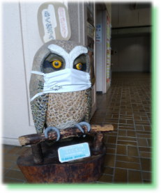 | センター正面玄関にいるマスク姿の「ふくたろう」 |