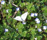 先日16日(日)にセンター農園で今年初めてのチョウを見ました。今年初めて見たモンシロチョウにうれしさとともに、春を感じました。急いでカメラを取りに行きました。もう農園にはいないかなと思いましたが、いました。(おそらく同じチョウ!?)私を待ってくれていました。ゆっくり近づき接写。オオイヌノフグリのかわいい花にチョウが似合っているでしょ。(にこにこぼくじょう)