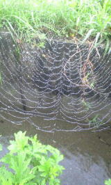 雨上がりに水滴のついたクモの巣を見つけました。ビーズかレース編みのようで陽が当たってキラキラして思わず見入ってしまいました(^^)