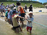 7月19(土)少年自然の家「玄海の家」において、センター主催事業「レッツ・ゴー!5&5」(第2回)〜海で遊ぼう!in 玄海」が行われました。夏真っ盛り、青い空と海という最高のロケーションのもと、幼児と小学生の80名が地引き網に挑戦しました。「ヨイショ!ヨイショ!」の掛け声の中、みんなで力を合わせて大きな網を引き上げると、網の中には大きなスズキ、イカ、タイ、チヌなどたくさんの魚が入っていました。とれた魚は、漁師さんにその場でさばいてもらい、さしみで食べました。子どもたちは、活きた魚がさしみに調理されていく様子を見ながら、おそるおそる口にすると「おいしい!」と大歓声。初めての体験に子どもたちの目はキラキラと輝き、笑顔あふれる一日でした。(ゴーゴー隊長)
