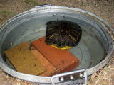 中庭にいるカメですが、雨の日はほとんど池(鍋ですが…)の水につかっています。晴れの日はよく歩いているのですが。毎日何を考えているのでしょうね♪(なりちゃん)