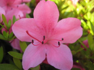 2010/05/30(日)晴れ ツツジの花をよく見ると、上方の花びらだけに斑点があります。これは「密標」または「ガイドマーク」と呼ばれるものです。花粉を運んでもらう昆虫に、密のありかを教えるものだそうです。自然界の造作はうまくできていますね。(ちょび)