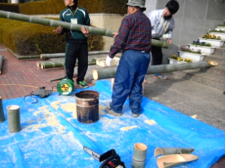 門松の竹を切り出しに午前中から山に入り、ちょうど竹の大きさをそろえているところです。一つ一つを手作りにすることをここセンターから発信していけたらと思い職員一同がんばっております。(P)