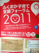 2011/11/18(金)雨 いよいよ2週間後に、「ふくおか子育て支援フォーラム2011」が開催されます。「〜みんなをつなぐ場づくりをめざして〜」をテーマに、午前中は基調講演、午後は6つのテーマカフェを開きます。子育てに感心のある方は、ぜひ12月3日(土)に、糟屋郡篠栗町にある福岡県立社会教育総合センターに集合しましょう!詳しいことはこのHPに掲載しています。たくさんの方のご来場をお待ちしています。(ケン坊)