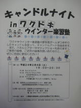 2月4日(土)〜5日(日)にセンターの主催事業「ワクドキウインター楽習塾」が開催されます。その事業の中で「キャンドルナイトinワクドキウインター楽習塾」を実施します。内容は小学生がオリジナルキャンドルを作って、大きなキャンドルアートを描きます。また、センター学習ボランティア「若杉の会」のブラックパネルシアターやMr.kooのマジックショーなども行う予定です。日時は2月4日(土)19:00〜20:30です。参加費は無料で事前の申し込み等は必要ありません。ぜひご自由に参加ください。お待ちしております!(まあちゃん)