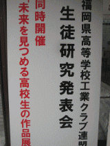 今日は、第21回福岡県高等学校工業クラブ連盟主催の生徒研究発表会、テーマ:「未来を見つめる高校生の作品展」が開かれています。県下14校の生徒さんによる研究発表と展示会です。ソーラーエネルギーの研究、電光掲示板、二足ロボット、車、空き缶プレス機など、たくさんの作品が展示されています。全て生徒さんによる手づくりということです。どれも素晴らしい作品で、感動しました。展示会は、今日まで社教センター、20日からは、久留米の青少年科学館で開催される予定です。ぜひ見に行かれてはいかがでしょうか。(ケン坊)
