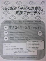 2012/9/8(土)曇り時々雨 12月1日(土)に、「ふくおか『子どもの育ち』支援フォーラム」が、開催されます。昨年に引き続き2回目です。家庭教育や子育て支援関わっていらっしゃる方々や子育てに感心のある方が、一同に集まり、日頃の取り組みについて見つめたり、今後の参考にしたりする日です。午前中は基調講演、午後からはテーマカフェがあります。詳しいことは、今後、ホームページに掲載されますのでご期待下さい。皆さんのご参加をお待ちしています。(ケン坊)