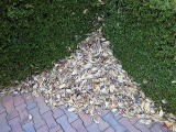 この「せんた〜日記」でも度々紅葉の映像を楽しんで頂いていますが、当然足元にはたくさんの落ち葉が広がっています。全体の構成として紅葉を引き立てているように見えますし、踏みしめるカサカサと音を立てて楽しいですが、強風が吹くとこのように吹きだまりのように集まってしまいます。思いっきり中にダイブするには量は少なめ、何よりそのようなことをしている暇はありません。いよいよ明後日からゆずフェスティバルが始まります。お客さまを気持ちよくお迎えするためにも掃除掃除・・・(注:この後きちんと掃除をしておきました)(とんちゃん)