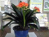 今、センターのロビーに“クンシラン”が見事に咲いています。クンシランという名前でもらんの仲間ではなく、ヒガンバナ科の植物です。艶のある緑色の葉っぱでオレンジ色の花が特徴です。この花は、職員が事務室で大事に育てていて、咲く時期をずらすため、日光の当て方や水やりに気を配りながら、今、一つの花がきれいに咲いているところです。センターに来られたら、ちょっと足を止めて“クンシラン”をご鑑賞くださいね。(run☆)