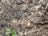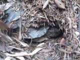 周りの土や枯葉と同化して見分けがつきにくいかと思いますが・・・。写真の中央部分にカメがいます!!地面から顔だけを出していて、微動だにしません。水槽の中には、カメの子どもがいます。随分大きくなったようで、これからの成長が楽しみです。このカメの親子はセンターの中庭にいますので、センターへこられた際には、是非見に来られてください!(クー)