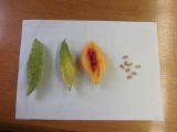 2013/8/23曇り グリーンカーテンとして育てていたゴーヤは、写真のように緑色からオレンジ色に変化し、種の収穫もできました。中の種も白色から鮮やかな赤くドロッとしたものに包まれたものに変わり、この赤い部分は食べることもできるようです。このような目立つ色をしているのは、鳥などに食べてもらって種を遠くに運ぶためなのでしょうか?自然界はうまくできているなと改めて感じました。収穫した種で来年も涼しげなグリーンカーテンができますように!!(クー)