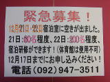 12月21日22日の宿泊室に空きがでました!21日が60名程度、22日が200名程度の宿泊研修を受け付けることができます。大研修室や講堂なども空きがあり、研修室にも余裕があります!(体育館は使用不可) 研修人数によっては、2泊3日の研修も可能です!17日までのお申し込みとなりますが、研修を検討されている方がいらっしゃいましたら、ぜひお問い合わせください!!電話(092)947-3511 (Choco)