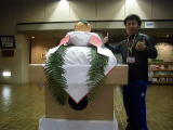 2013/12/26( 木)曇り時々雨 12月18日のセンター日記の写真に登場した、窓越しの怪しい白の物体の正体が判明しました。その正体とは・・・・センター指導員が一所懸命作製していた「巨大お鏡」でした!隣に移っている指導員と比べてると、その大きさが伝わると思います。玄関には巨大門松、中に入ったロビーには巨大お鏡と、これで社会教育総合センターも新年を迎える準備が整いました。皆さんも大掃除や新年を迎える準備で慌ただしい師走をお過ごしのことと思います。寒さ厳しい折、お体に気をつけて、よいお年をお迎えください。(スイスポ)