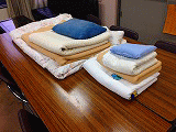 研修団体が入所されると、宿泊される方々に、オリエンテーションで寝具のたたみ方を説明します。これまで実物を使って説明していましたが、オリエンテーションは研修室や体育館で行うため、長机1台をベット代わりにするとかさばって結構大変でした。そこで、今回約4分の1サイズのミニ寝具を作成しました。おままごとに使うような可愛い寝具が出来ました。左側が実物です。これで、スムーズで分かりやすい説明ができると思います。(しんべい)
