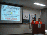 第151回生涯教育まちづくりフォーラムが開催されました。実践発表として、県立ありあけ新世高等学校「てっぱん部」の社会貢献活動が発表されました。「てっぱん部」はお好み焼きでまちおこしに貢献する部活動です。部長、副部長と1年生2名の計4名が発表のために来られました。オレンジのハッピもかっこよく、最後は元気な掛け声の披露もありました。これからも地域貢献活動をがんばってくださいね。(麗奈)