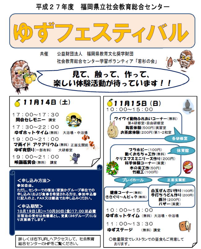 お天気が続いております。篠栗の空は今日も快晴であります。さて、本日は当社教センターの3大行事の一つ、「ゆずフェスティバル」の宣伝です。本年は11月14日(土)〜11月15日(日)の2日間にわたって開催されます。各種イベントや工作教室、体験コーナー等盛りだくさんの内容です。この時期ならではのゆず湯も無料でご入浴できます。毎年多くの方にご参加いただいております。今年も皆様方のご参加をお待ちしております。また、宿泊をご希望される方は本日から受付となっております。先着順、36グループとなっています。朝からバンバンFAXが届いておりますので、宿泊希望でまだ申し込まれていない方はお早めにどうぞ!(ninjya)