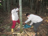 2015/11/27(金)曇り 当センターでは、毎年12月を過ぎると正面玄関前と少年自然の家の玄関前に大きな門松を設置しています。今日はその門松に使用する竹を取りに行ってきました。設置する門松は約3mにもなるので、十分な長さと重みに耐えることのできる太い竹が必要となります。できる限りまっすぐなものを選びチェーンソーで切り離しました。我ながら良い竹がゲットできたと思っています。門松はもう間もなくお見せすることができると思いますのでご期待ください。(かんこう)