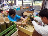 5月21日(土)から、「中国・四国・九州地区生涯教育実践研究交流会 第35回大会」が社教センターで行われます。その事前準備のため、学習サポート室の指導員達の手によって、交流会の時使用するための竹を切り、磨く作業が行われていました。竹の切り口を、小刀とやすりで磨いていきます。各県から参加者が集う研究大会で、手作業で磨かれた竹たちは、社教センターからの“おもてなし”になると思います☆(kiko)